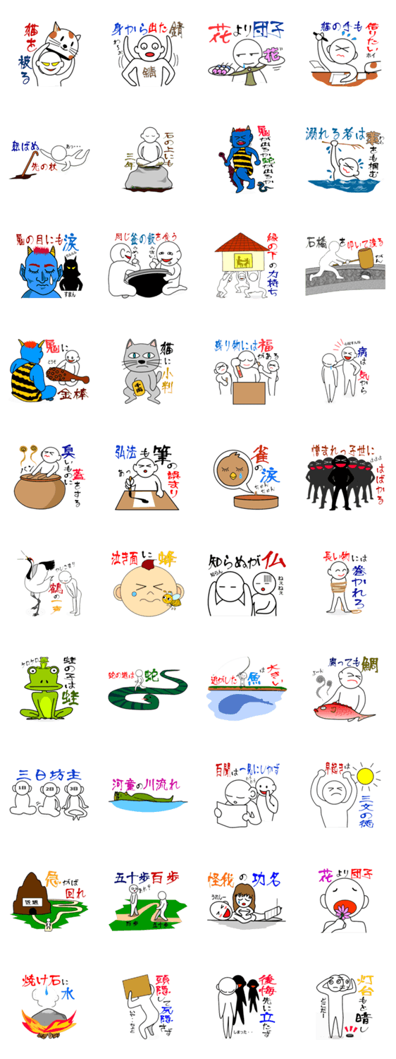 スタンプ説明 ことわざを絵図に置き換えてみました。少し冗談も交えながら面白く覚えられるかも?