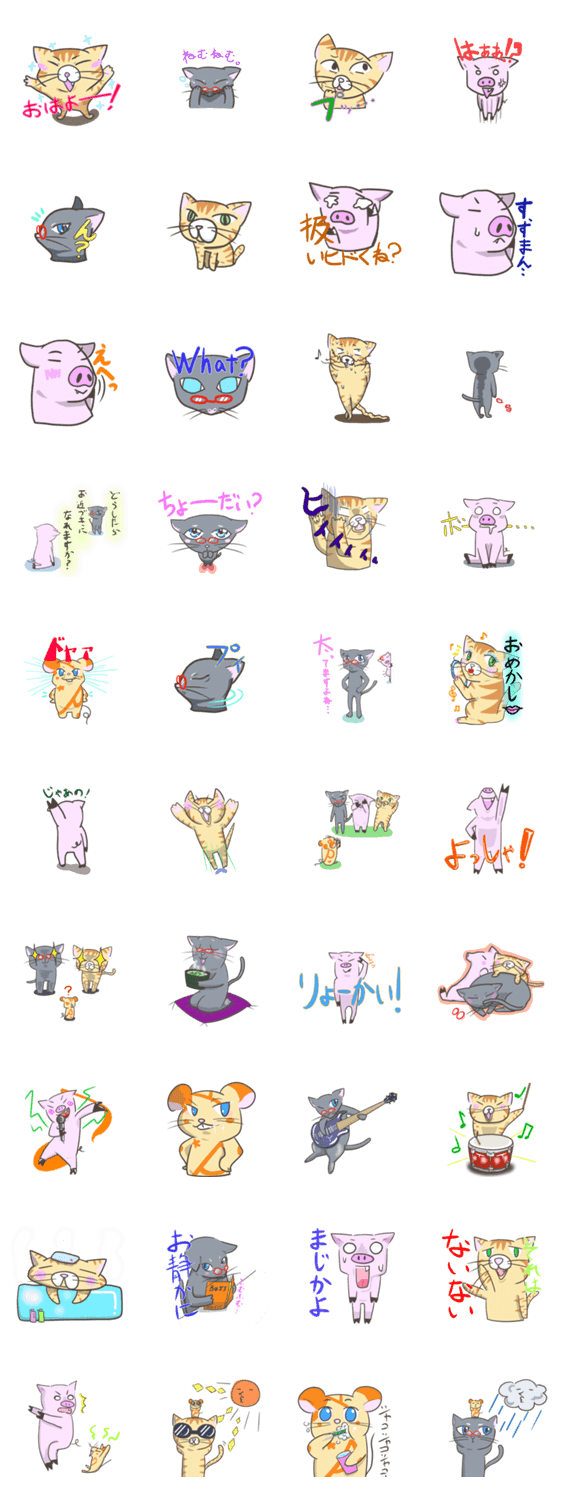 スタンプ説明 愛知県で活動中のバンドTHE Parkingがアニマル化されました!ブタのふーさん、トラ猫のまーくん、クールなゆーちゃん、ハムスターのあーちゃん達の日常をごらんあれ!