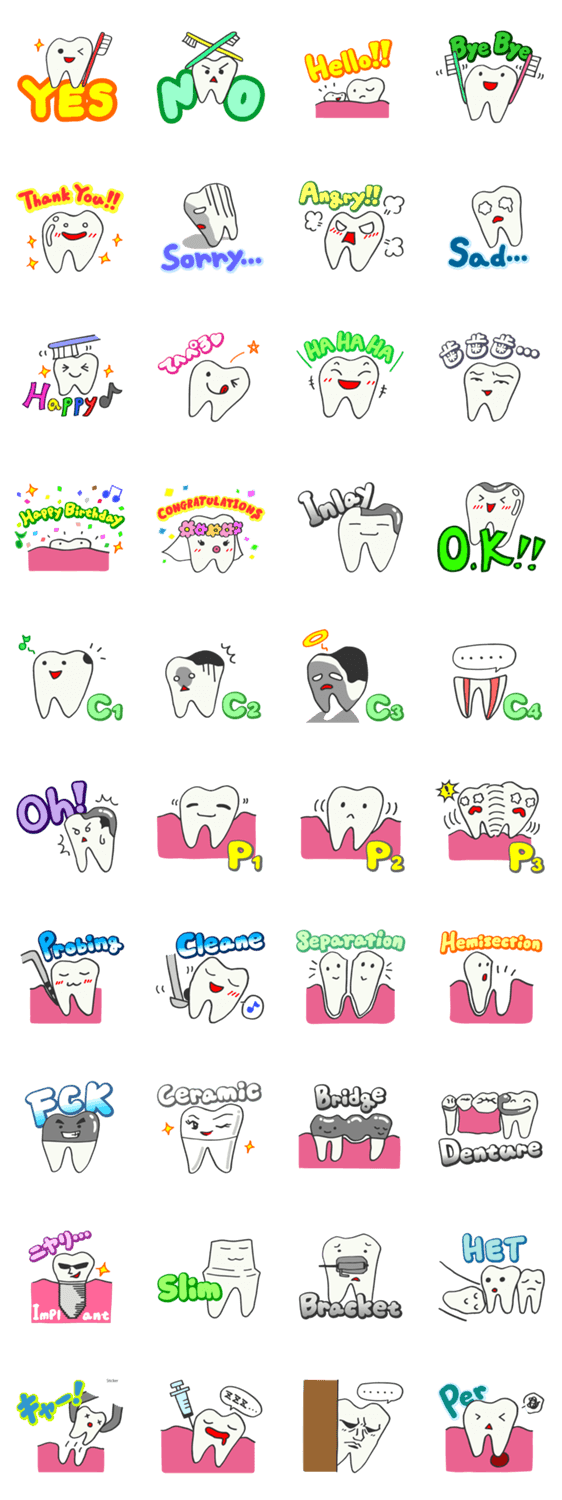 スタンプ説明 歯医者さん、歯科衛生士さんがお仕事で使う歯科用語をスタンプにしてみました。歯科の世界がこれで解るかも!?少しマニアックな大臼歯スタンプです。