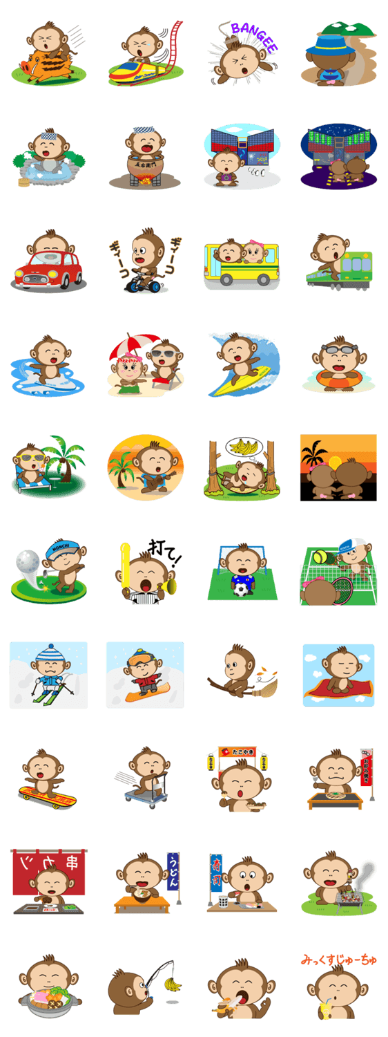 スタンプ説明 「もんち」シリーズ第4弾!ギィーコギィーコと三輪車に乗ってやってきた〜今度の「もんち」は、お出掛けに、アクティビティに大忙し。大阪B級グルメも味わっちゃえ!