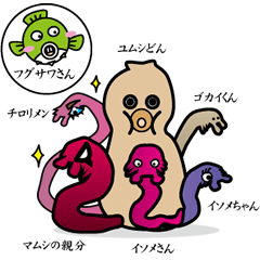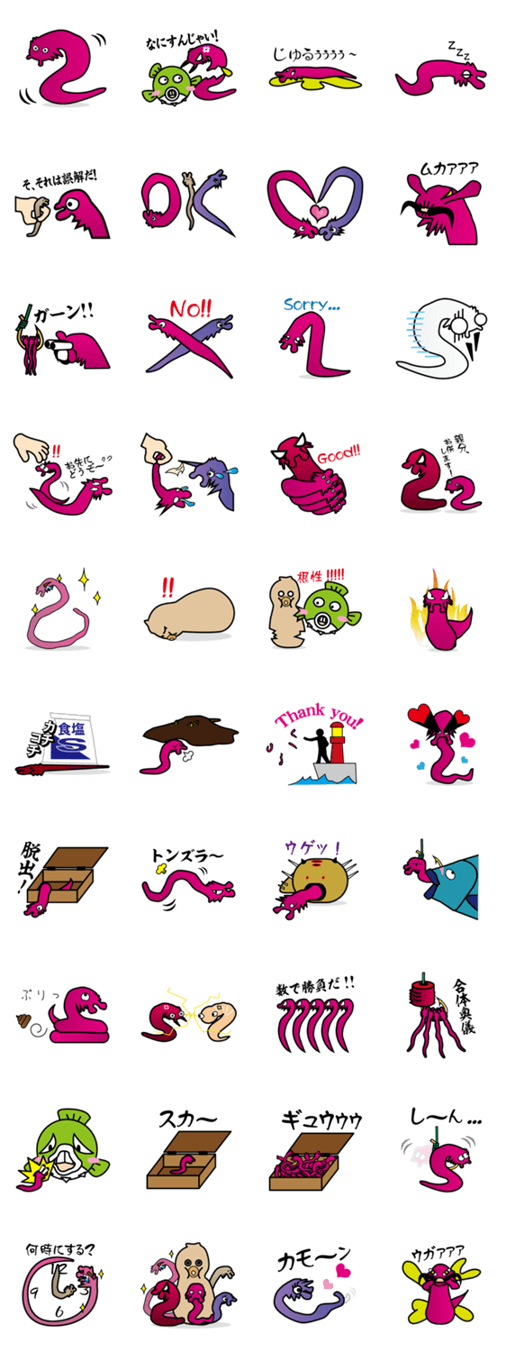 スタンプ説明 アオイソメの生き様をスタンプにしました。釣りをする方でも、しない方でも使えるキモカワイイでちょっとグロテスクなスタンプです。