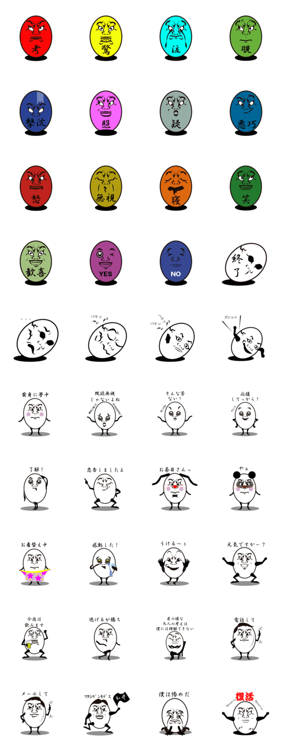 スタンプ説明 ちょっとキモイ 国産卵のオッサン、ハンプティダンプティダ~ディ~キモイけど愛情いっぱい茹で上がっりで心はつるっつるです。頭もね・・・