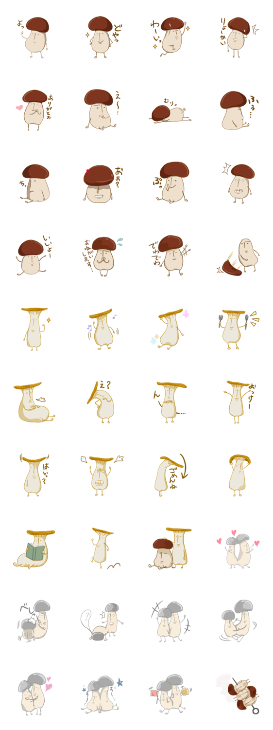 スタンプ説明 ゆる~くやろうぜ?だって俺たち、きのこだもん。無気力感の漂うシュールなきのこスタンプ。