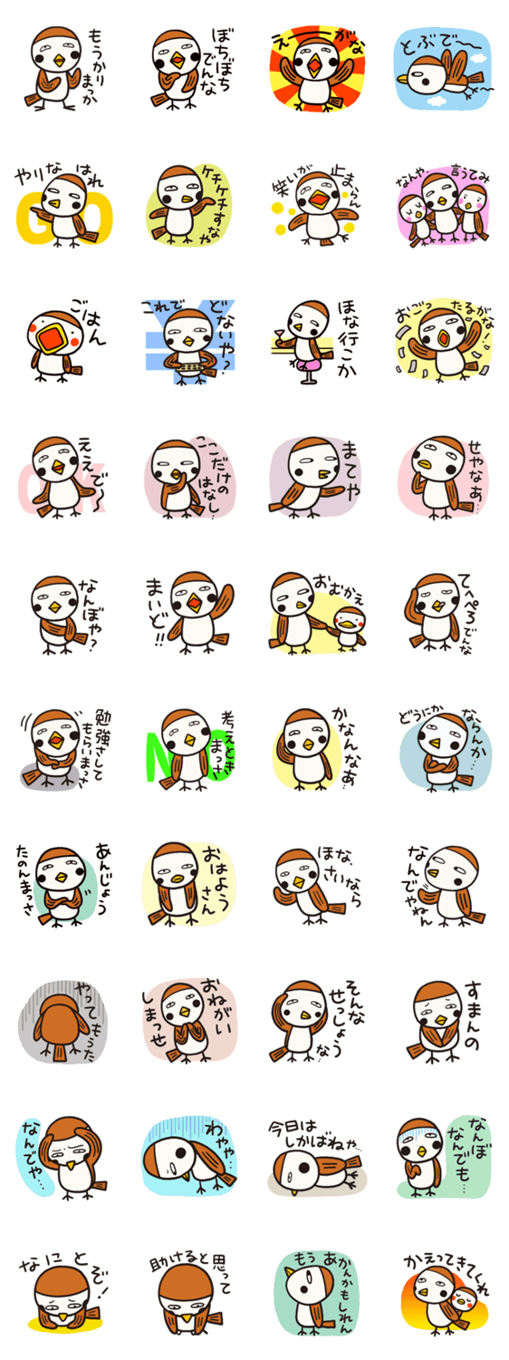 スタンプ説明 商売人の皆様、お待たせしました。景気のいい時も悪い時も、ビジネスにプライベートに、便利に使えるスズメのスタンプをご活用下さい。