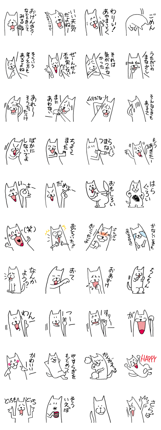 スタンプ説明 全身が白い犬。だからつまらないけどおもしろい、彼の適当な生活。作:いとうたけひこ
