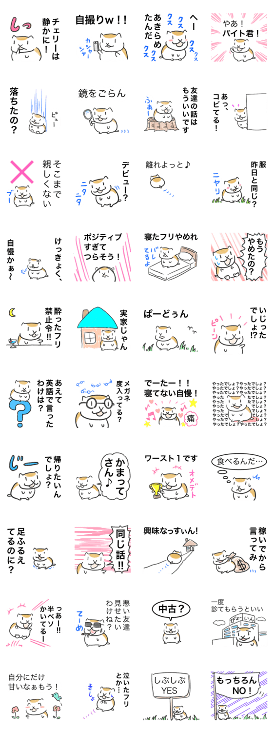 スタンプ説明 空気を読まないハムスター。名前はゴルちゃん。大学デビューの人や上司、酔った人、草食系男子、帰国子女、メガネっ子、プラス思考過ぎる人に対して異常に厳しい。