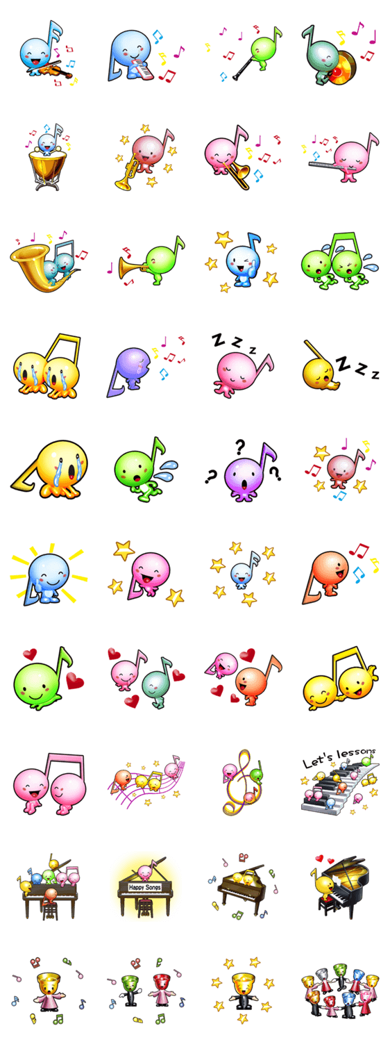 スタンプ説明 カラフルで可愛い音符のキャラクターが、見る人をホンワカ幸せ気分にしてくれます。音楽好きな人に是非使ってほしいスタンプです。