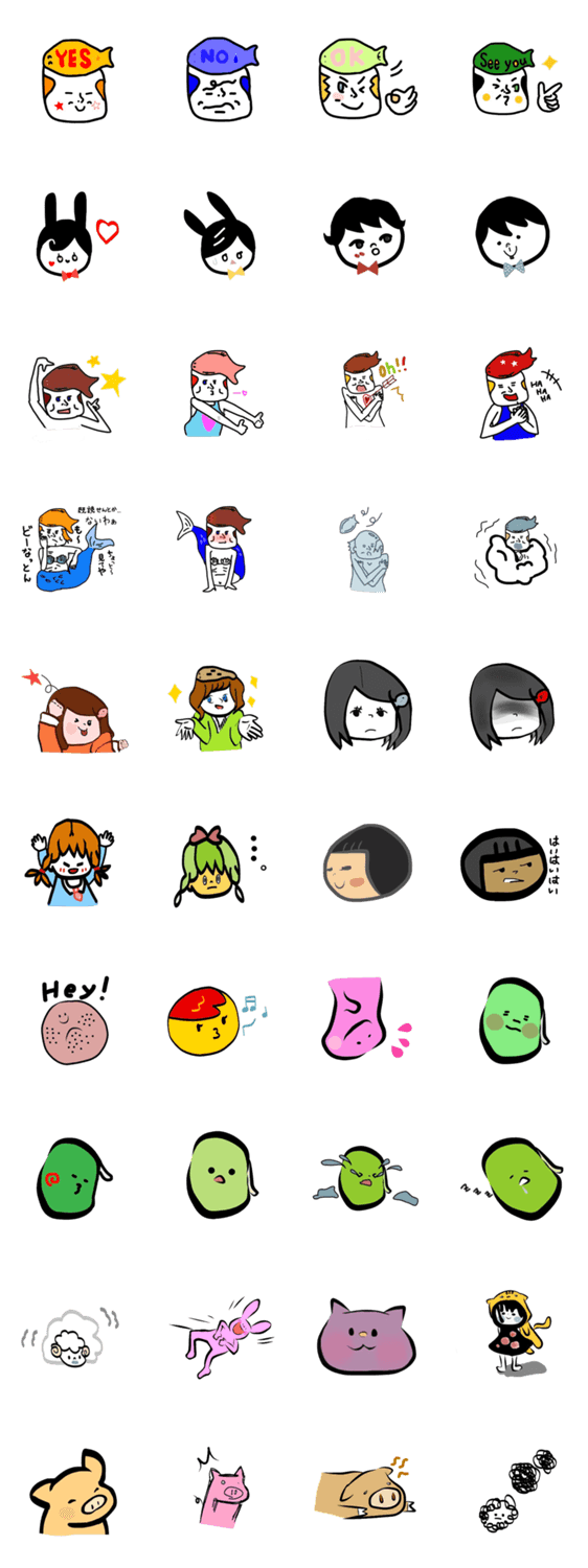スタンプ説明 丸かったり四角かったり豆だったり魚臭かったり…などなど(笑)かわいいキャラをまとめてみました☆ねこに女の子、ウサギやソラマメ、人魚にこぶた♪ね、かわいいでしょ?