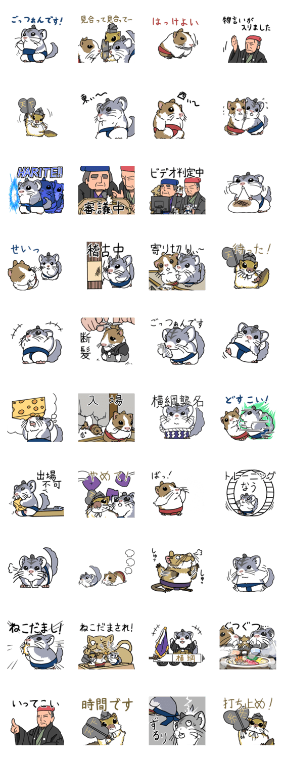 スタンプ説明 童話「ねずみのすもう」のようなねずみの力士の取組みのスタンプです。チンチラやハムスターの力士たちです。