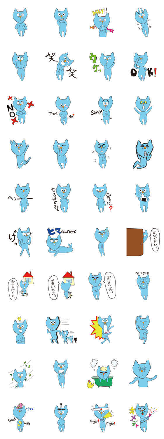 スタンプ説明 青い猫のスタンプ。どこか抜けていて、ブサイクだけどかわいい?動きがいろいろあって、どのシーンにも使えます。