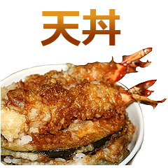 天丼のスタンプです。タレのかかったサクサクの天ぷらをご飯と一緒にいただく瞬間は至福の一言ですね。飯テロにも。揚げ物、どんぶり物。実写写真食べ物スタンプシリーズ。