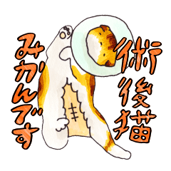 スタンプ説明 トレードマークはエリザベルカラーとお腹の手術あと。三毛スコ「みかん」のゆるっと日常会話集です。