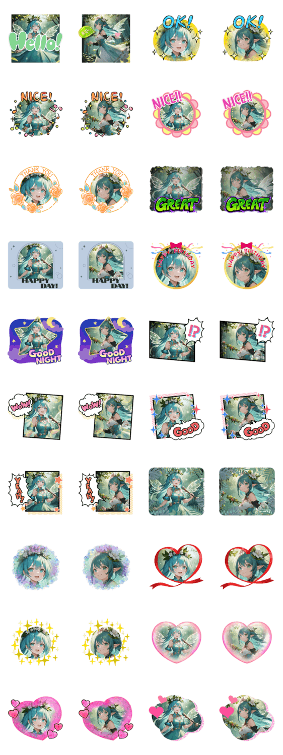 ☆美少女・2☆日常萌えスタンプです。かわいいグリーンのエルフ、精霊、妖精が好きな方は、ぜひ毎日使ってみてください。☆AIイラストとLINEスタンプメーカー使用☆癒し