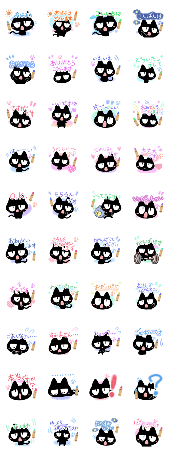 じろーっと見ているような、だるそうな黒猫。かわいい、くろねこのクレヨンで書いたような文字のスタンプ。可愛いクロネコ好きな方にぜひ【かたこ】ちいさい・まるい