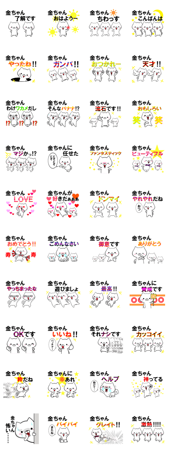名前が金田・金本・金城・金子・金松・金藤・金谷・金山・金川・金井・金村・金崎・金太郎・金治・金也、など、あだ名が金(キン・カネ)ちゃんに使えるスタンプです。