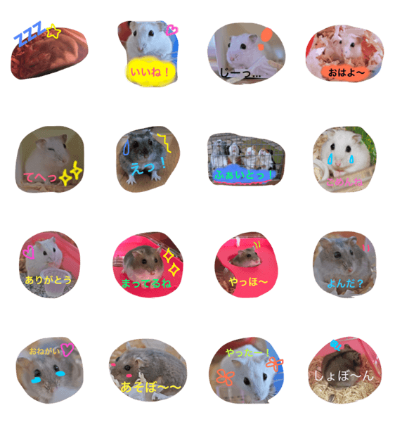 我が家のジャンガリアンハムスターのスタンプを作りました!それぞれの表情に合わせたメッセージがついています。