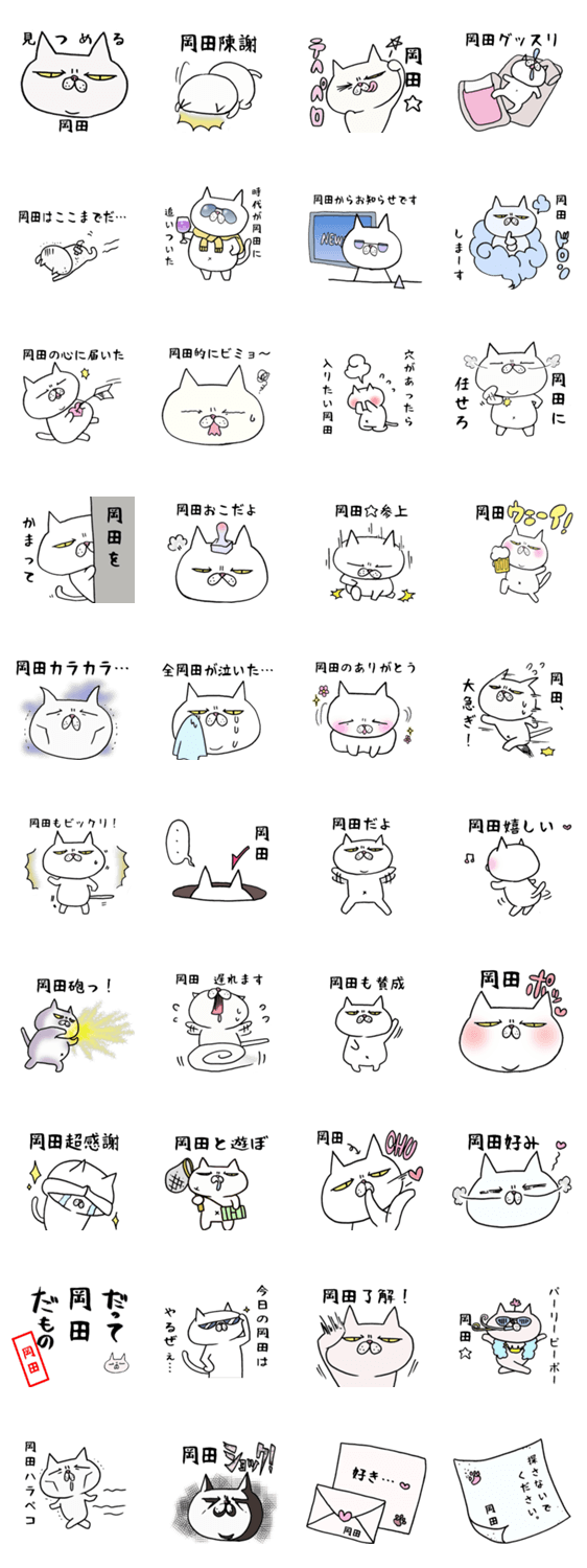 岡田さんの岡田さんによらない岡田さんのためのスタンプです。 どこか憎めないブサ猫の表情をお楽しみください!