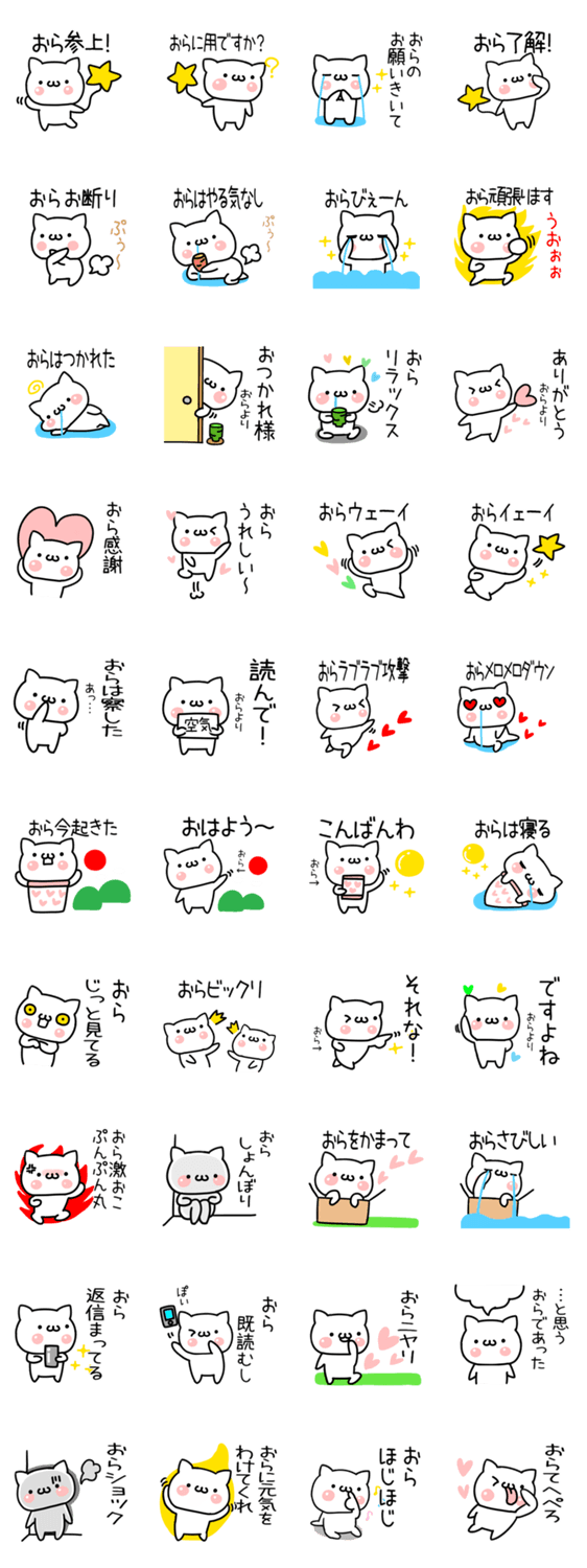 しろくてまるいネコ「おら」の無難に使える日常会話のスタンプです。「おら=自分」