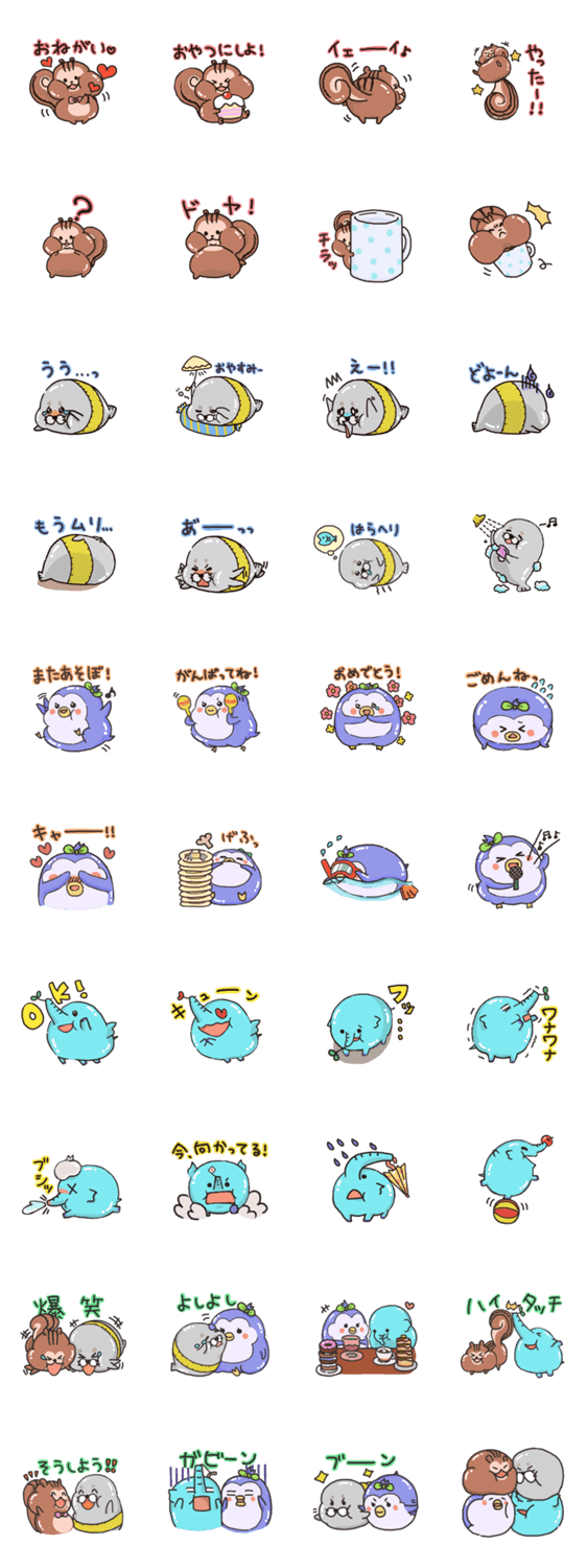 ぷくぷく太った4匹の動物たちのスタンプです。
