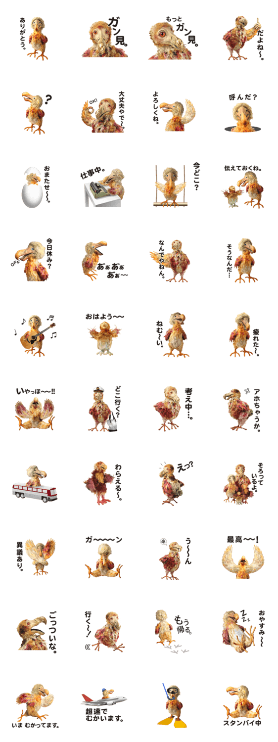 一度は地球上から絶滅したはずの飛べないズングリ鳥のドードーさん。スタンプで復活したら現代社会に適応しまくり!!あなたの気持ちや言葉を代弁しちゃいます。