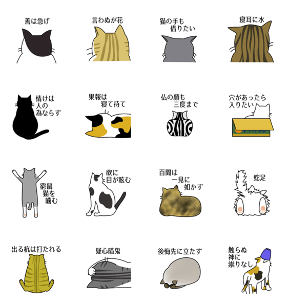 ことわざ付きの猫の後頭部スタンプです。