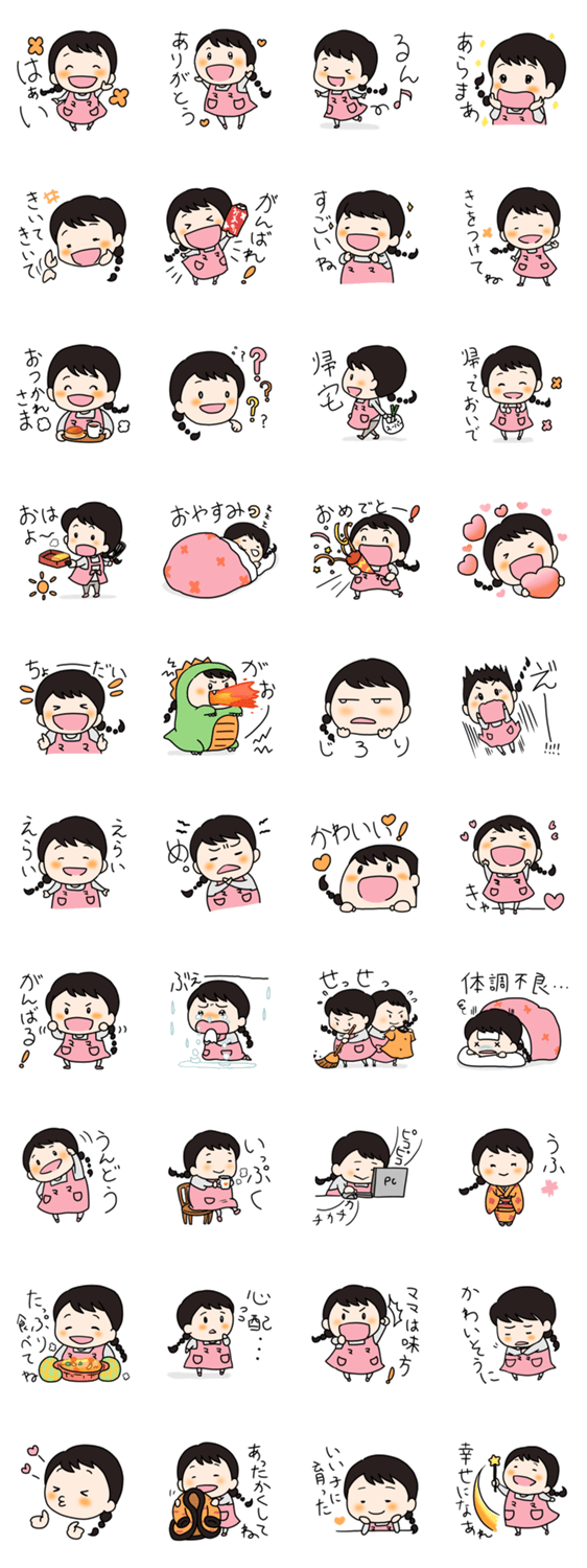 おさげのかわいいママ。美味しいごはんを用意してくれて、ださめの暖か服を出してくれる。そんな優しいママスタンプです。