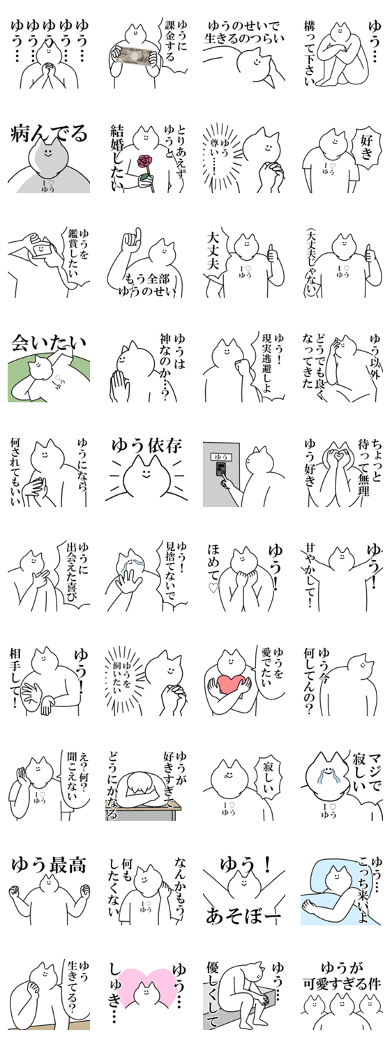 ゆうくん、ゆうちゃんに送る名前スタンプ。愛情強め。好きな人彼氏彼女推しに使える!メンヘラ、ネタ系、アイドル好きな方へ。ゆうき ユウキ ゆうすけ ゆうか/oroninet