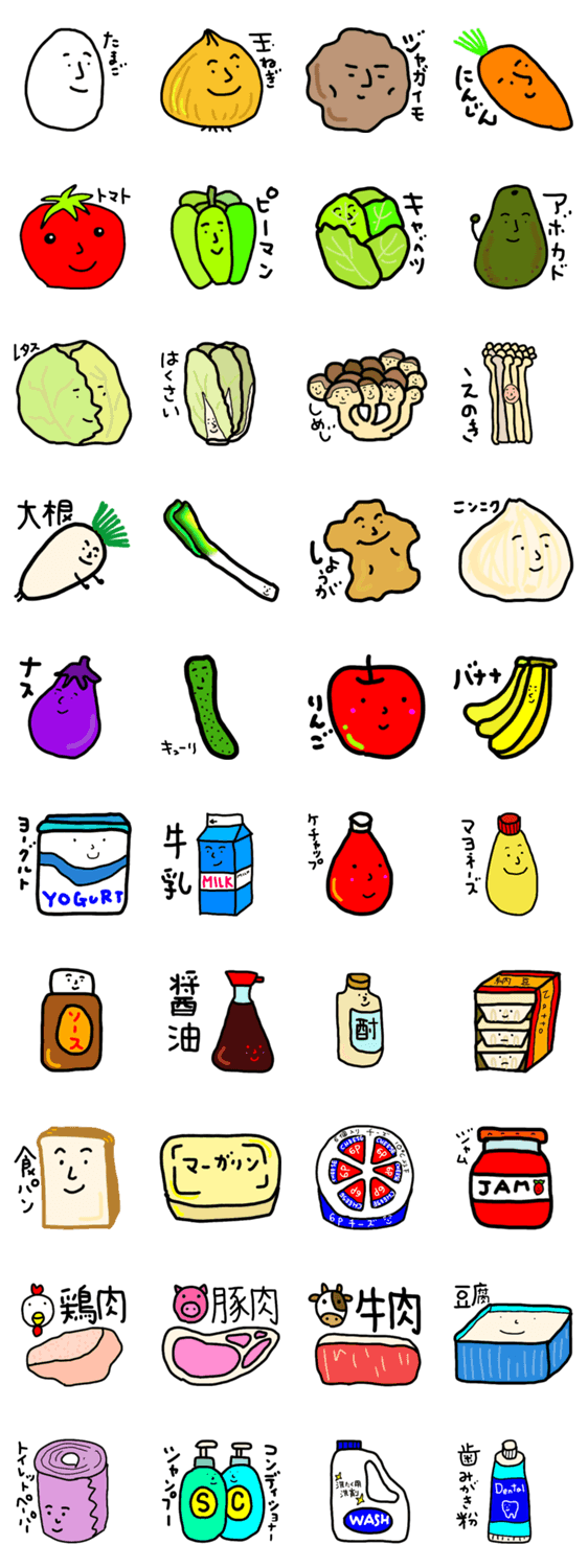 卵、玉ねぎ、じゃがいも、にんじん、牛乳、醤油やソース等の調味料、納豆、豆腐、トイレットペーパーやシャンプー等の日用品、ちょっと買い物頼みたい時のスタンプ