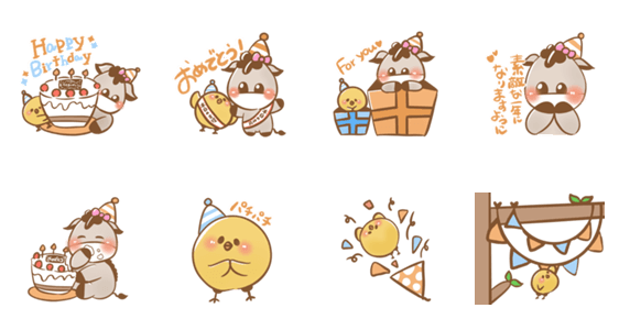 フォトスタジオcocoaのココちゃんとぴよきちがお祝いに!お誕生日やお祝い事に使いやすいスタンプとなっています!