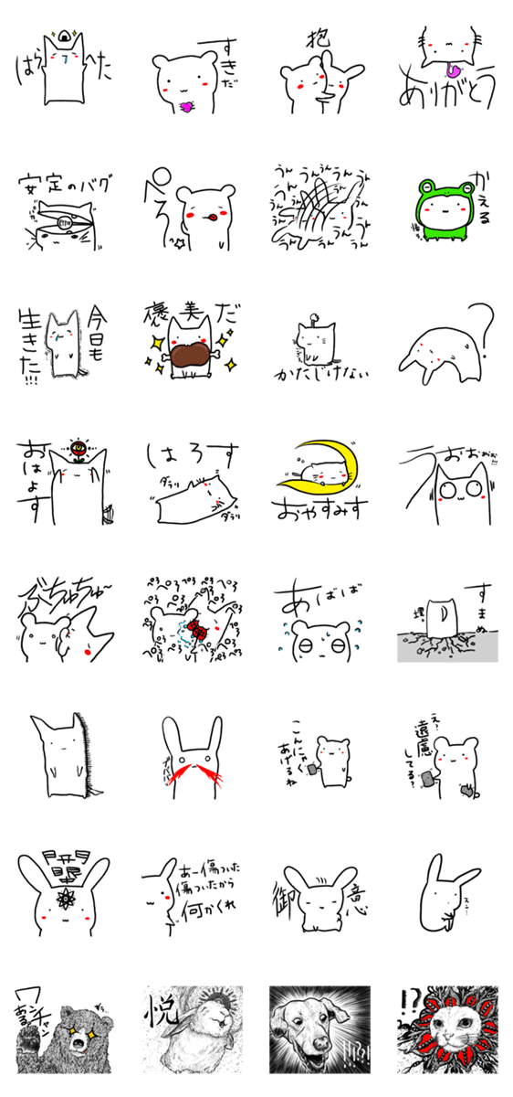 犬と猫と兎と熊のスタンプです。気持ちを伝えたい時、面倒な時、荒ぶっている時、気が触れた時など御自由にお使い頂けます。