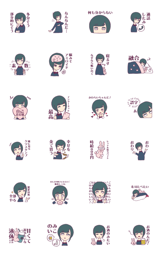 ジト目の女の子と可愛いうさぎのテンション低めシュール系スタンプ。可愛いけど可愛すぎない日常を。寿司食べたいと素数がオススメです。