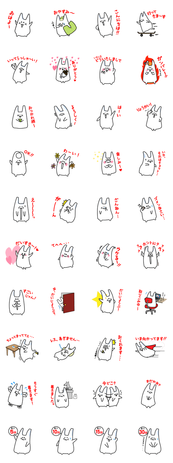 ウサギのようなレジ袋のような生き物「ウサぶくろ」のかわいい系スタンプです。袋なのに中に物を入れられるのはきらいです。日常会話に使いやすいセリフ満載です!