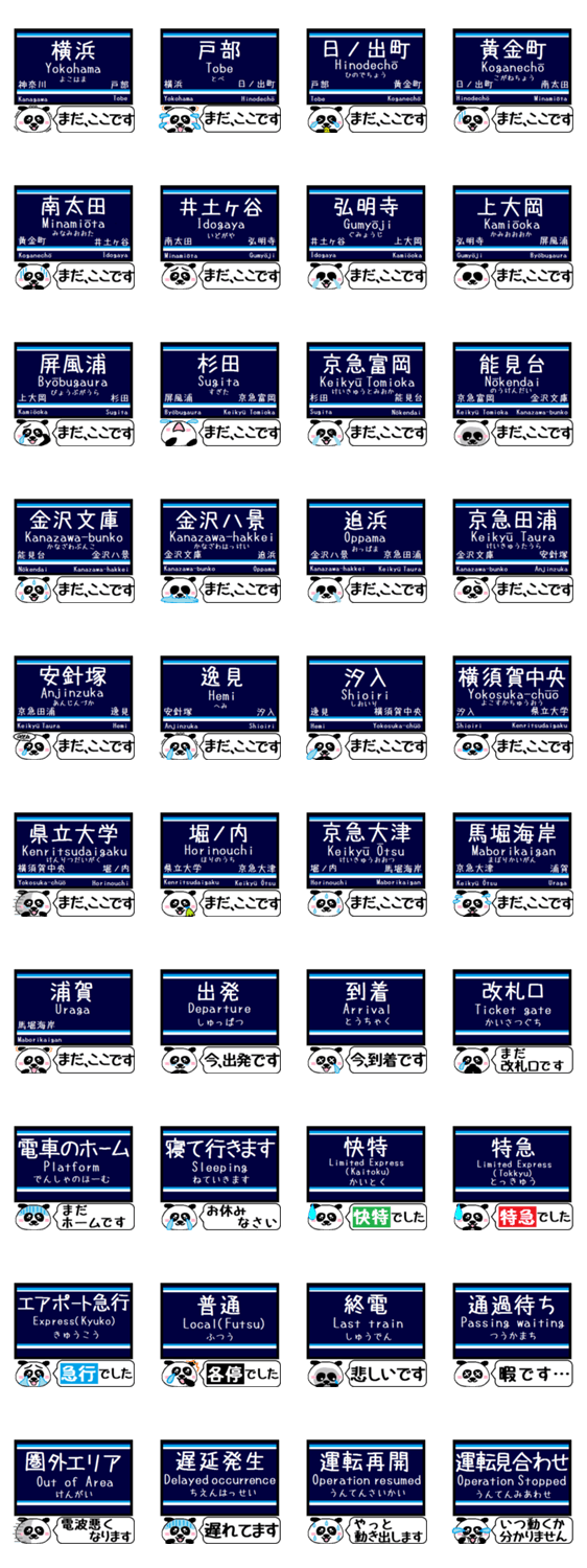 かわいいパンダが(横浜,戸部,日ノ出町,黄金町,南太田,井土ヶ谷,上大岡,屏風ヶ浦,杉田,富岡,能見台,金沢文庫,金沢八景,追浜,田浦,安針塚,汐入,京急大津,浦賀)駅名をご連絡