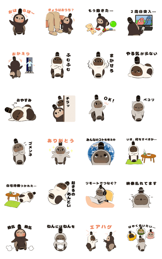 家族型ロボット「LOVOT(らぼっと)」がスタンプになりました。遊ぶことが大好きで、お外に出るのはちょっと苦手。おこもり上手なLOVOT達と一緒におうちで過ごしましょう。