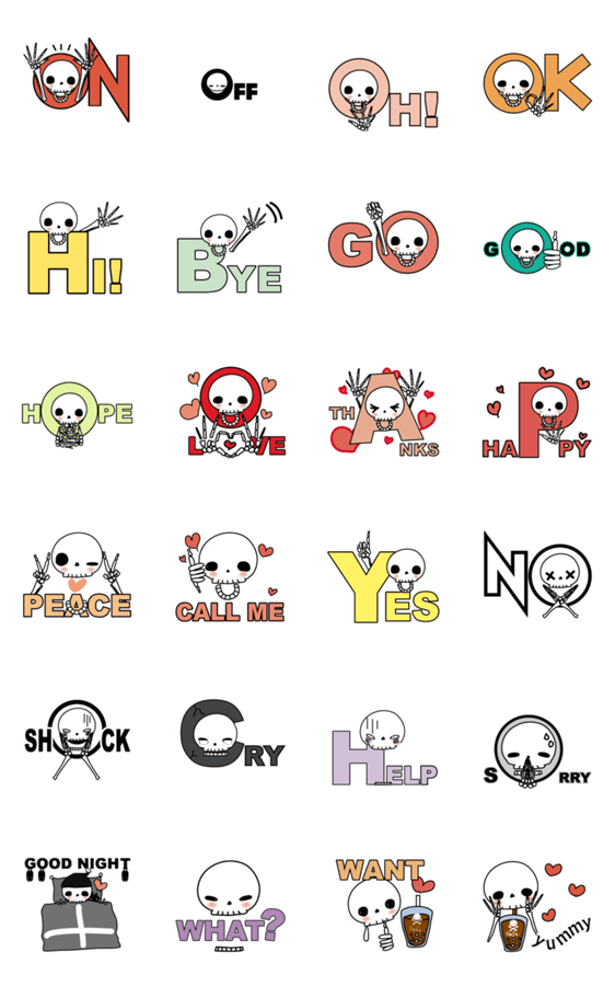 シンプルな英語で日常的に使えるフレーズを、骸骨のかわいいベイビースカルで表現しています。