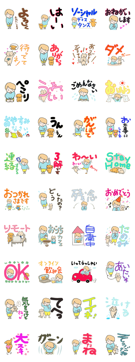 大きい文字でわかりやすく。男の子と猫と犬の仲良し家族です。