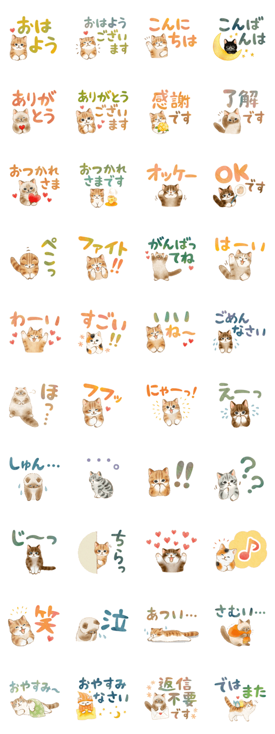 ねこのイラストに、使いやすいメッセージを添えました。 友だち同士で使えるものから敬語まで。カラフルで大きい文字のスタンプです。 よく使う基本のメッセージ多め。