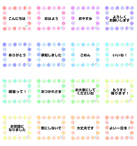 | スタンプ説明 | カラフルな丸のフレームスタンプです。パステルカラー。背景あり。日常で使える。使いやすい。枠。 現在この商品は一部のスマートフォン版LINE 10.3.0以上のトークルームでのみ使用できます。動作環境の最新情報はヘルプをご確認ください。 |