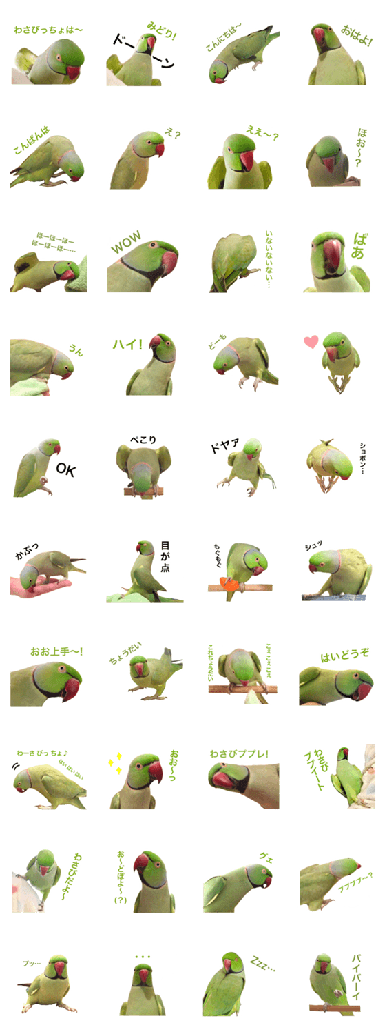 | スタンプ説明 | おしゃべりワカケホンセイインコのわさびっちょのスタンプです。よくおしゃべりする言葉を中心に日常で使えるスタンプにしました。 |