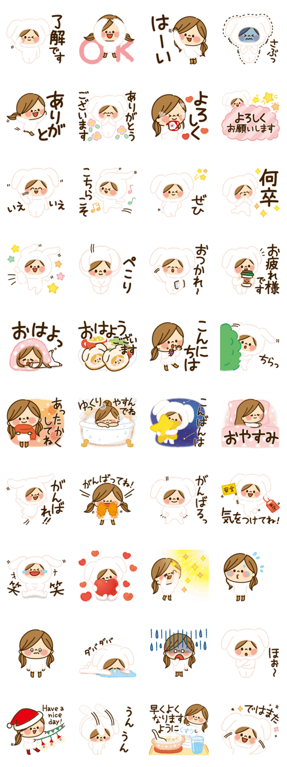 かわ主婦第52弾【ふわもこ冬編】はかわいい女の子の秋〜冬に使えるスタンプです!ふわもこなうさぎ着ぐるみとあったかニットで冬支度したかわ主婦バージョン!