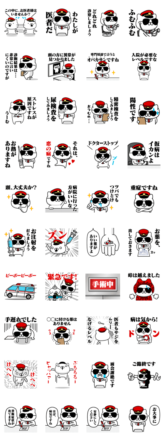 | スタンプ説明 | 医者/医師/ドクター/看護師/看護婦/病院/検査/手術/軍医/にゃんこ/猫/兵隊//軍人/軍隊/自衛隊/陸軍/海軍/サバゲー/エージェント/ミリタリー/消防士/レスキュー隊 |