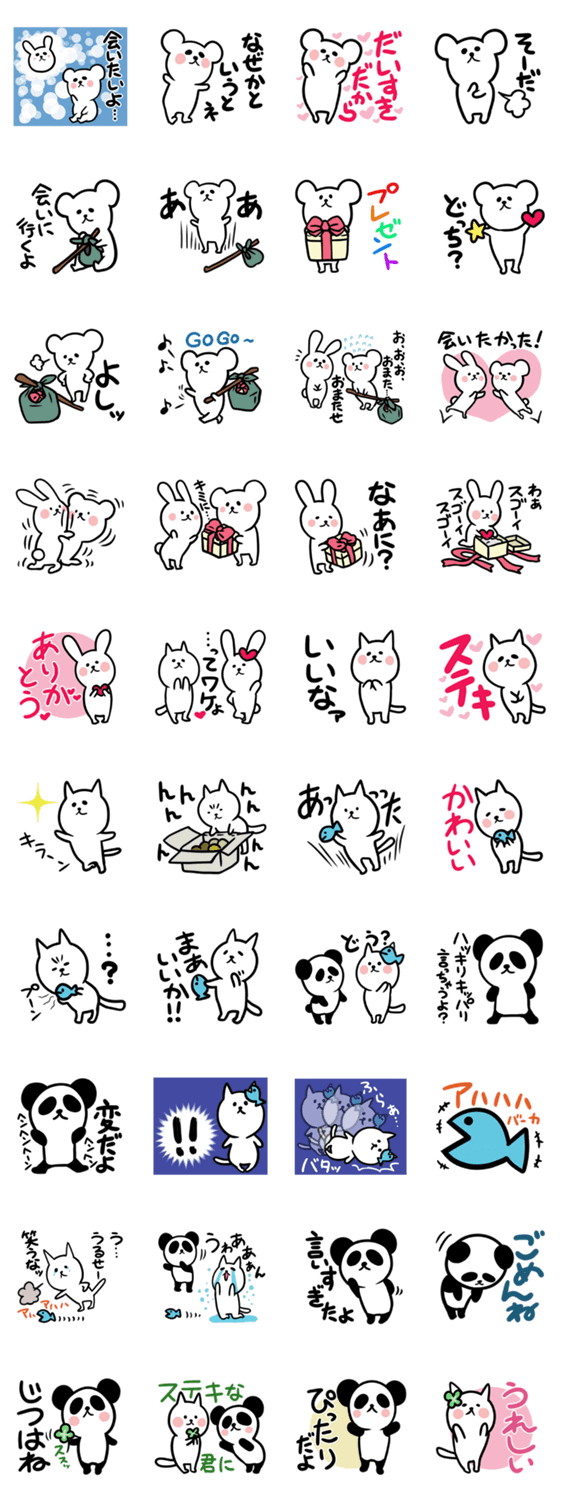 くまとうさぎとねことパンダのラブコメ風スタンプです。4匹の恋愛模様を楽しみながらお使いください。カップルの方、遠距離恋愛の方にもオススメ!