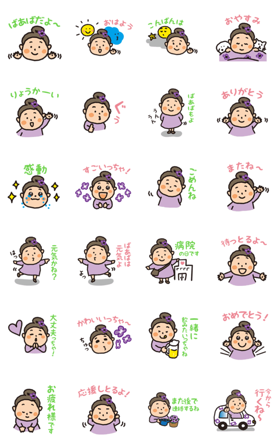 かわいいおばあちゃんのスタンプです。北九州のかわいいばあば。「お花が大好きっちゃ〜!」