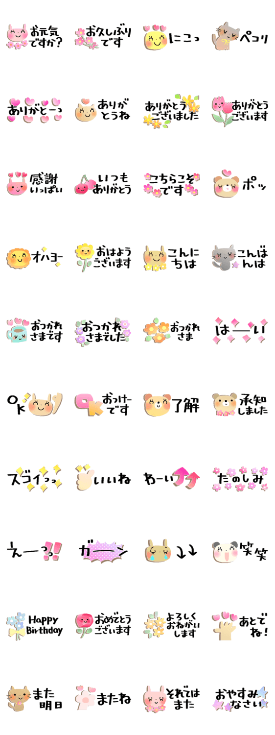 縦サイズが少し小さめ、シンプルな省スペース40個。文字が大きくて短い言葉なので見やすくサクっと送れます。花多めで春らしい色合いの大人かわいいスタンプです。