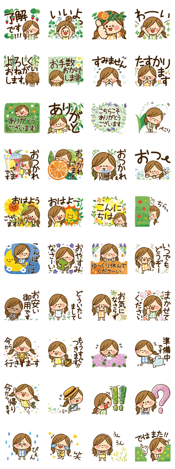 かわ主婦第55弾【ボタニカル編】はかわいい女の子のボタニカル柄のスタンプです!かわいらしい花や爽やかなグリーンが癒やしと元気をお届けします!敬語入りです。
