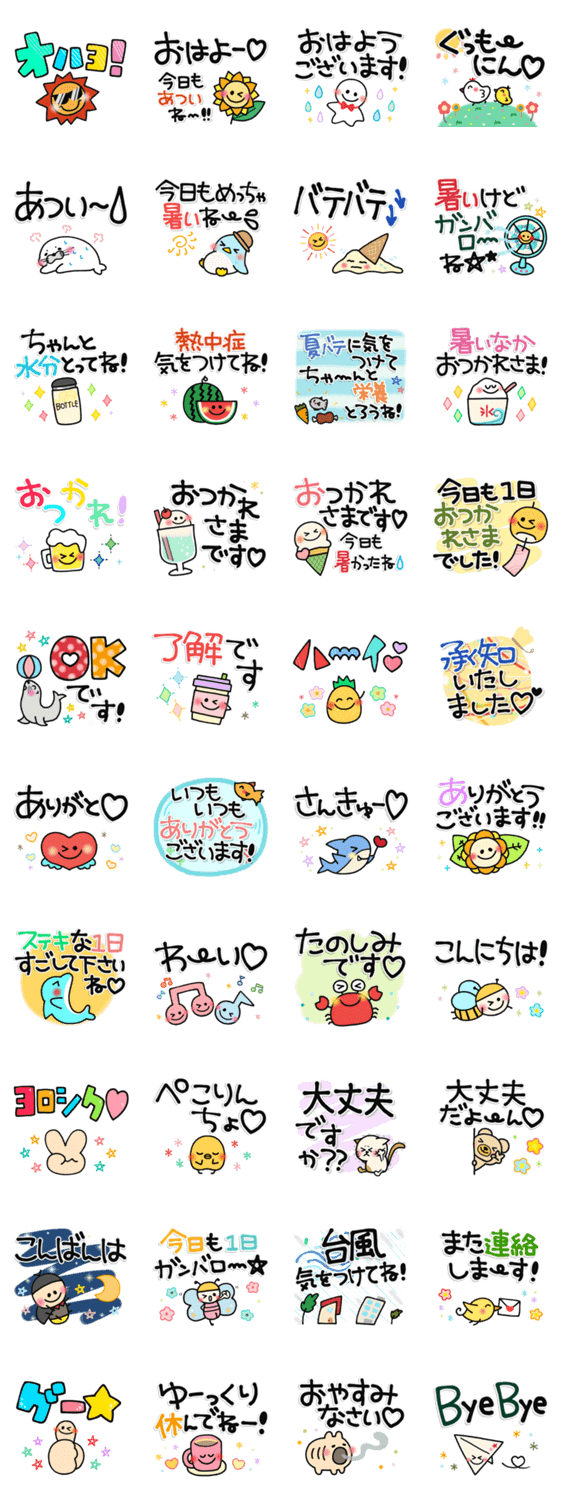 シンプルで可愛すぎないので大人も使いやすいスタンプの夏ver♪夏に使える言葉と毎日使える日常的な言葉を収録したデカ文字の見やすい基本セットです!晴れ/夏/雨/敬語など