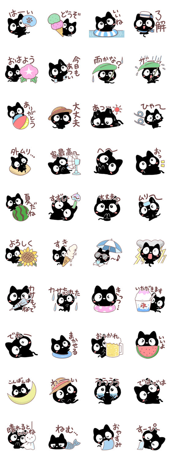 毎日使える『クロネコすたんぷ』の夏版です。あいさつや、日常会話に加えて、夏や暑い時期に使える猫スタンプもあります。黒ねこ好きな方にぜひ。【かたこ】