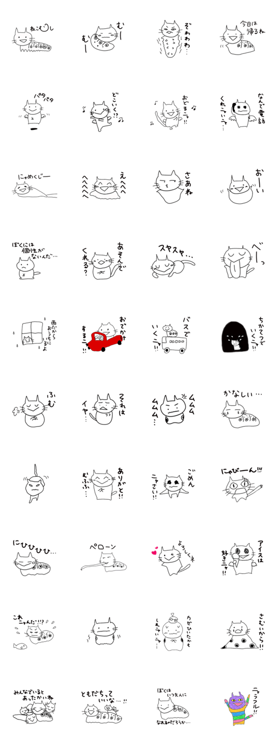 ねこむしは、ねこといもむしのハイブリッド。彼はとても珍しいねこ。好きな食べ物はアリ。ねこむしと彼のキュートなともだち猫のスタンプ。
