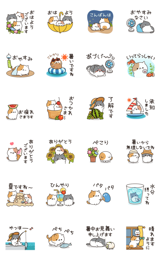 今日も今日とて猫らしくのびのび生きている元気でかわいいぶちねこ達の動くスタンプ。第5弾は夏バージョンです♪