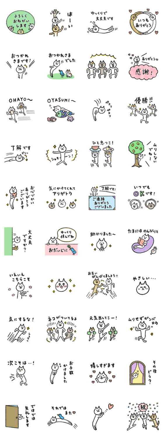 シュッとスリムな猫たちの毎日使えるスタンプです。敬語や気づかいの言葉もたくさん入っています♪